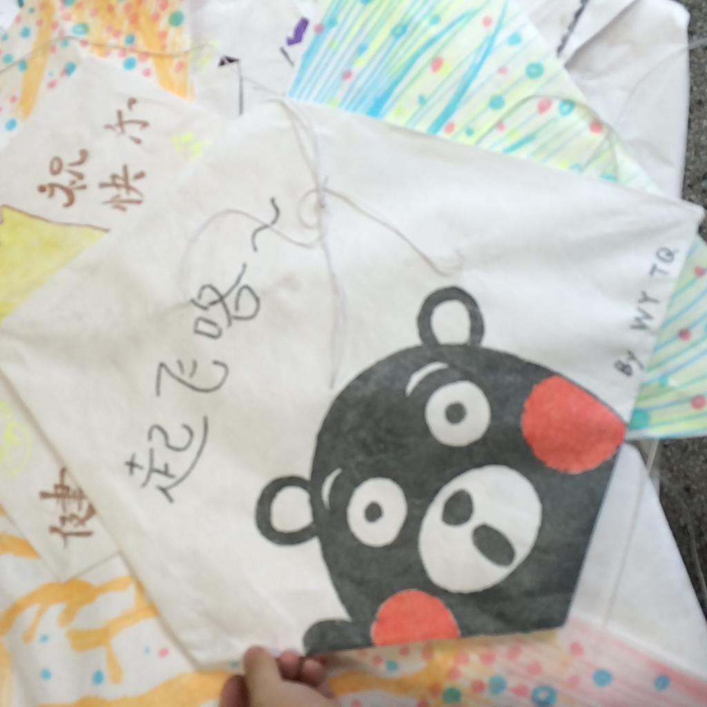 参赛人员以2-4人为一组的形式制作风筝,经过2小时左右辛苦制作,风筝基本完成,然后各组为风筝上色,并写上祝福,在风筝上画上各种精美图案,或者根据风筝的形状设计了卡通形象。