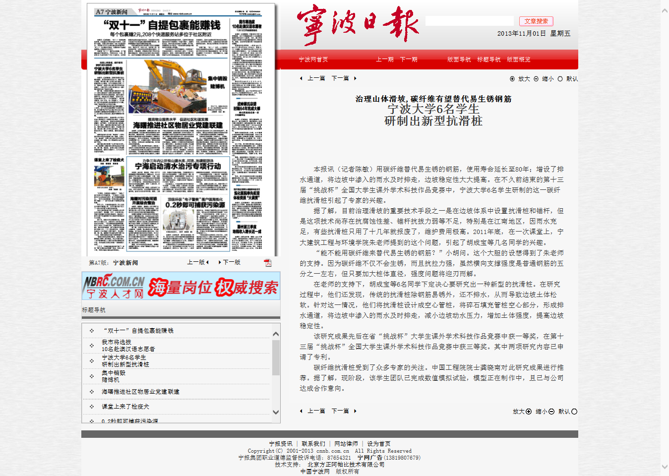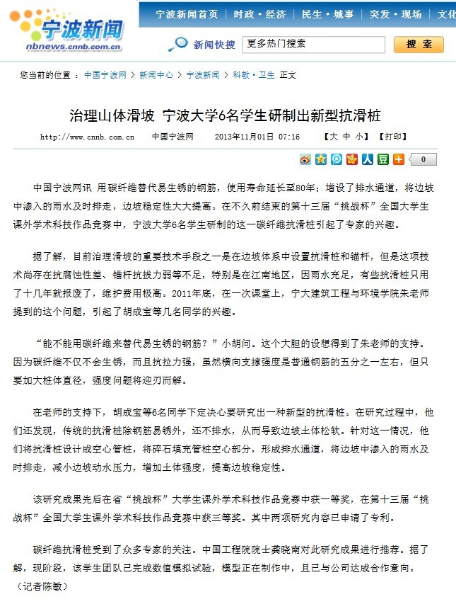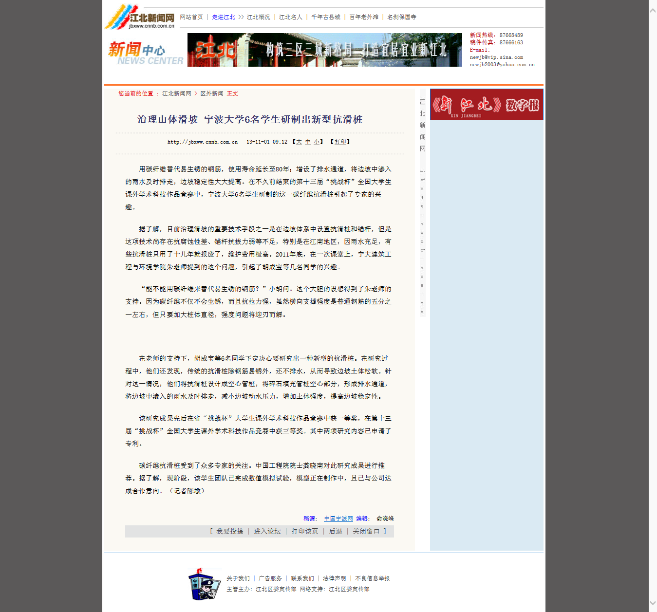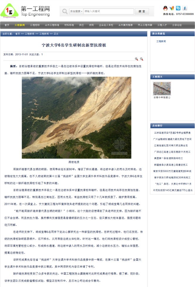 学子研制出新型抗滑桩的消息更是不胫而走,引起整个公众的注意;并且已有相关企业就作品与其团队接洽。