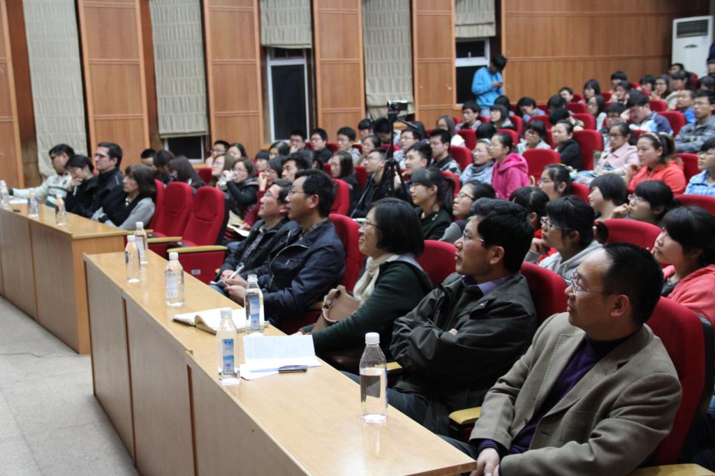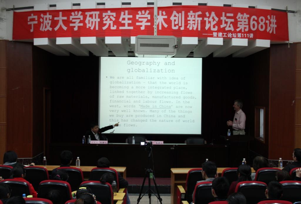 哈姆尼特教授以“什么是地理学”作为切入口,逐步过渡到对于地理学重要性的阐述上,并指出在当今全球化的进程中,地理学对于经济、政治等方面的重要影响。在谈到space-time compression(意为时空压缩)时,哈姆尼特教授借用大量的图片和数据资料,形象地为我们讲解了在当今社会space-time compression的具体表现方面。论及学术界流传一时的“地理学终结论”,教授鲜明地表现了自己的立场:经济的发展离不开地理学,而经济的发展需要也会促进地理学的进一步发展。所以,地理学知识对于普通公民也是相当重要的。