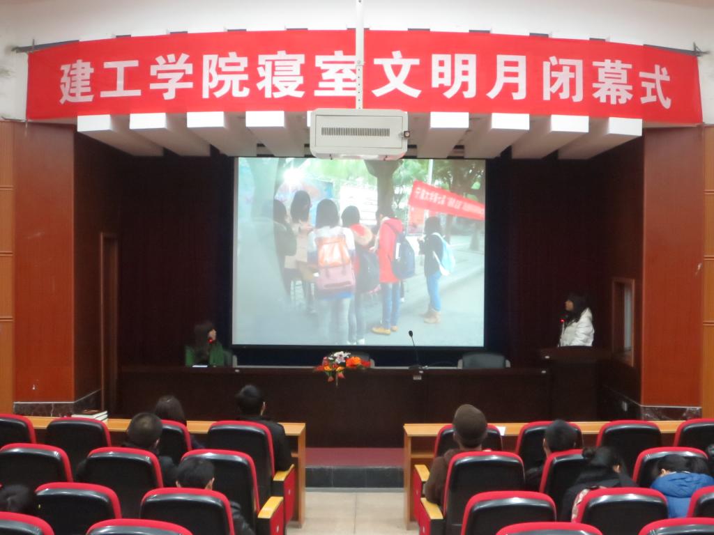 闭幕式上,活动负责人胡王玉同学首先做了活动总结,接着,通过幻灯片的播放,大家一起欣赏了本次寝室文明月的活动成果展。随后,主持人宣布了获奖寝室并进行了特色寝室颁奖仪式。最后获奖寝室的寝室长依次上台发言,阐述自己对本寝室的装扮理念,展示装扮的成果。