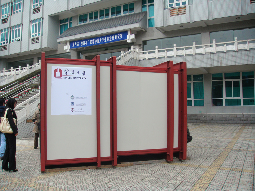 “M-home特种用房有限责任公司”创业团队的设计作品为新型简易环保住房,主要针对建筑工地、旅游区、灾区等所需的临时建筑要求进行设计的。M-house,意为“我的家”,红色屋顶,白色墙壁,看起来非常美观。采用钢架折叠结构,折叠后占用空间较小,运输便捷,安装方便。它可以三个叠加在一起,占用土地的面积更小。在房间内,还有一套可折叠式的简易家具,生活的舒适度会更高。其墙体采用隔温、防雨的高科技材料制成,可以避免日光烘烤带来的闷热问题。用四个“小腿”来固定地面,经模拟测试可以抵御10级以下的大风。比起活动板房来,它少了用水泥固定地面的繁琐,避免了水泥对土地的破坏,因此更加环保。另外,M-house一个独特的优势就是重复利用率接近100%。设计者蔡小斌说,普通的活动板房在拆除后,其材料二次利用度仅为45%到60%,而拆除后,除个别零件需要必要的修复外,几乎无需添加任何材料就能再次使用。