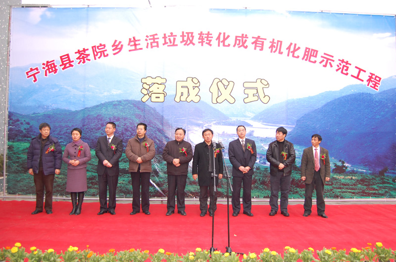 院长张殿发、宁海县人大主席杨加和、宁海县环保局局长陈炳寿、宁海茶院乡书记陈剑波、宁海茶院乡乡长蒌黛敏。各领导作了重要讲话,并为“宁海县茶院乡太阳能—生物集成技术反应器示范工程”揭牌。到会的领导和专家对该示范工程的科学性、实用性和经济性给予高度评价,建议在宁海县及宁波市全面推广,进一步优化农村生活垃圾三级处理模式,真正实现农村生活垃圾处理的减量化、无害化和资源化。