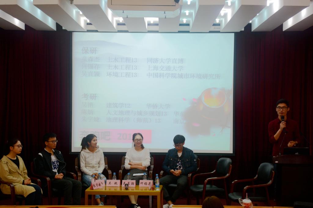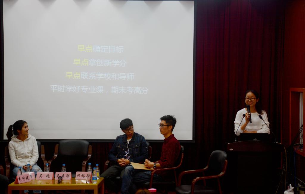 座谈会伊始,作为考研保研成功的学长学姐们分别分享了他们各自的经历,也让同学们初步了解到有关于考研保研的相关流程和注意事项。直博同济大学的童森杰同学以历年同济大学的分数线为例,讲述了自己关于保研的经验。他说考研不一定好的大学就比差的大学难考,还要看专业水平和许多其他的因素,不能一概而论。此外,他还说关于考研最重要的一点是要不断地问自己:“我能不能以及适不适合静下来专注地做一件事?”如果可以,那么也许考研是一个不错的选择。何锡存同学分享了他参加上海交通大学夏令营并成功保研的经历,让同学们知道要敢想敢拼,也许就会成功。保研中科院城市科学研究所的吴直颖同学则讲述了关于论文发表和学术严谨的重要性,成功考上华侨大学的吴艳同学以自身的经历告诉大家考研需早作准备,考研华东师范大学的陈炳同学和考研南京师范大学的朱宇婕同学也分别分享了自己的备考经验。最后,现场的提问环节也进行地十分热烈,可见开元网 同学们对考研保研的兴趣浓厚。