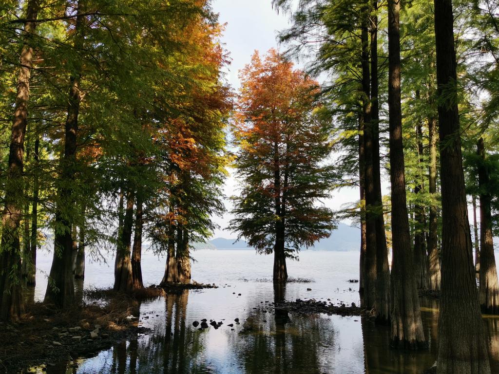 天空作美,秋高气爽,四明湖的杉林美得令人陶醉,那种深邃悠远宁静的美让人恍若一脚踏入原始森林,这是秋游第一站四明湖杉树林。杉林虽然还没有达到由绿变红后的江南童话之境,但是此时杉树林也别有风味,它高大挺拨,树形秀丽,既古朴典雅,又肃穆端庄。