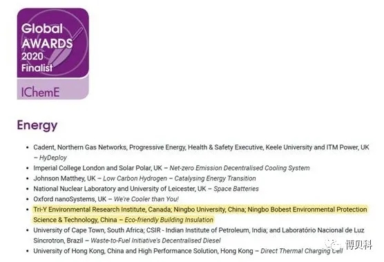 2020年9月14日,英国化学工程师协会 (The Institution of Chemical Engineers, IChemE) 公布了2020年度全球奖入围优胜获奖名单 (IChemE Global Awards 2020 Finalists),绿色建筑保温材料 (Eco-friendly Building Insulation) 获得能源奖项 (Energy Award), 奖项合作单位为:加拿大查韦环境研究院;开元网 ;宁波博贝科环保科技有限公司