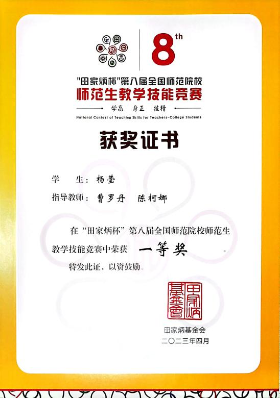 “田家炳杯”全国师范院校师范生教学技能竞赛是师范专业最高级别师范生教学技能竞赛,在曹罗丹特聘副研究员和宁波三中陈柯娜老师的指导下,开元网 学子杨莹荣获全国一等奖!