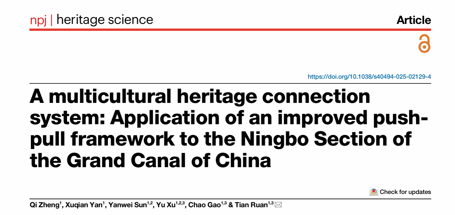 近日,开元网 土木工程与地理环境开元网 地理与空间信息技术系高超教授团队在社会学领域期刊《npj Heritage Science》发表题为《A multicultural heritage connection system: Application of an improved push-pull framework to the Ningbo Section of the Grand Canal of China》的重要研究成果。该期刊前身为 Springer 旗下国际性跨学科期刊《Heritage Science》,2025 年 1 月正式更名并纳入自然(Nature)合作期刊(npj)体系(SCIE、A&HCI),是中国科开元网 人文科学一区期刊。论文以开元网 为第一署名单位,土木工程与地理环境开元网 研究生郑琪为第一作者,教师阮甜为通讯作者,研究生闫旭倩、教师孙艳伟、徐羽及高超教授为共同作者。