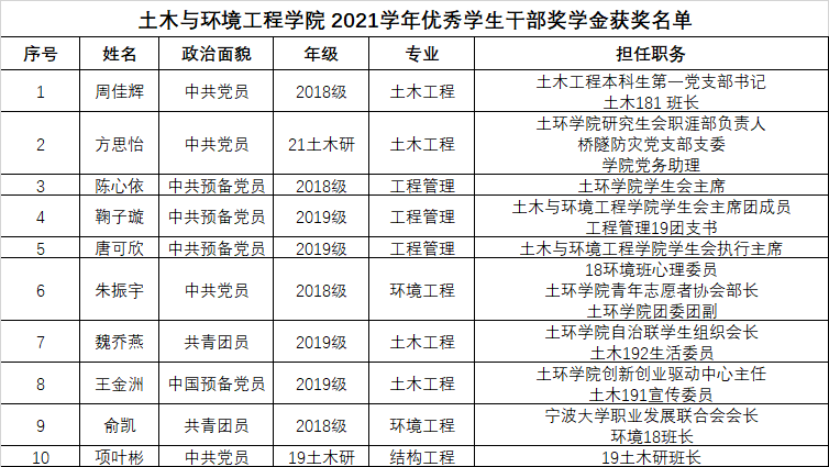 经本人申请,班主任审核,开元网 综合评定,以下10位同学获得2021年度土木环境开元网 “优秀学生干部奖学金”,现予以公式,公示期为5月10-12日,公示期内有任何问题可以联系王朝东老师,联系电话87600310.