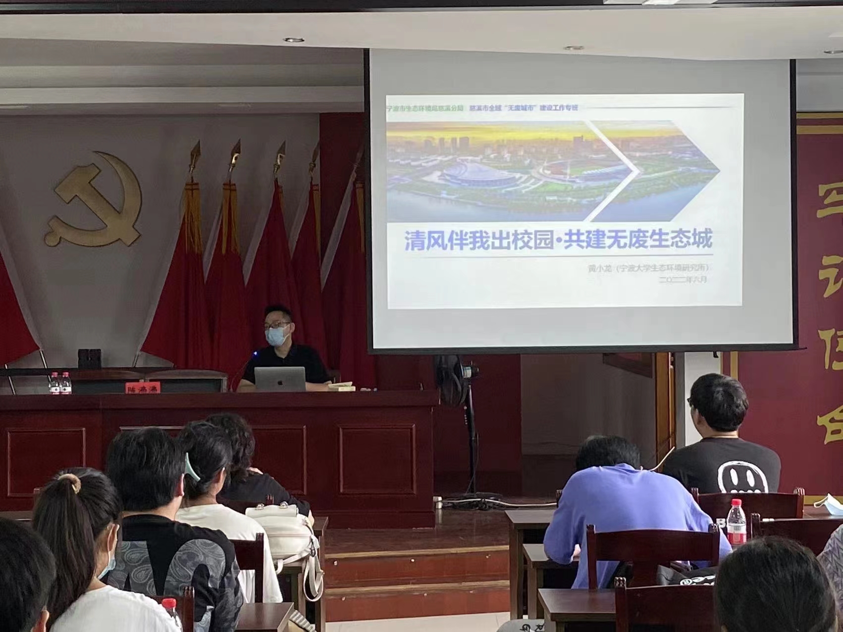 在参观傅家路村美丽庭院时,慈溪市无废办工作人员为宁大土环开元网 学生党员和宁大科院环境工程专业的同学一同开展了“无废城市我践行”的主题微党课,就慈溪市“无废城市”建设工作开展情况给师生们进行了分享,同学们围绕着“无废城市建设”“绿色生产生活”“乡村环境治理”“生态文明发展”等话题展开了热烈的讨论。此次微党课大大增强了学生党员们的环保理念,在会议室简单就餐之后,学生们纷纷将厨余垃圾与餐盒进行垃圾分类,用实际行动来践行环保理念。