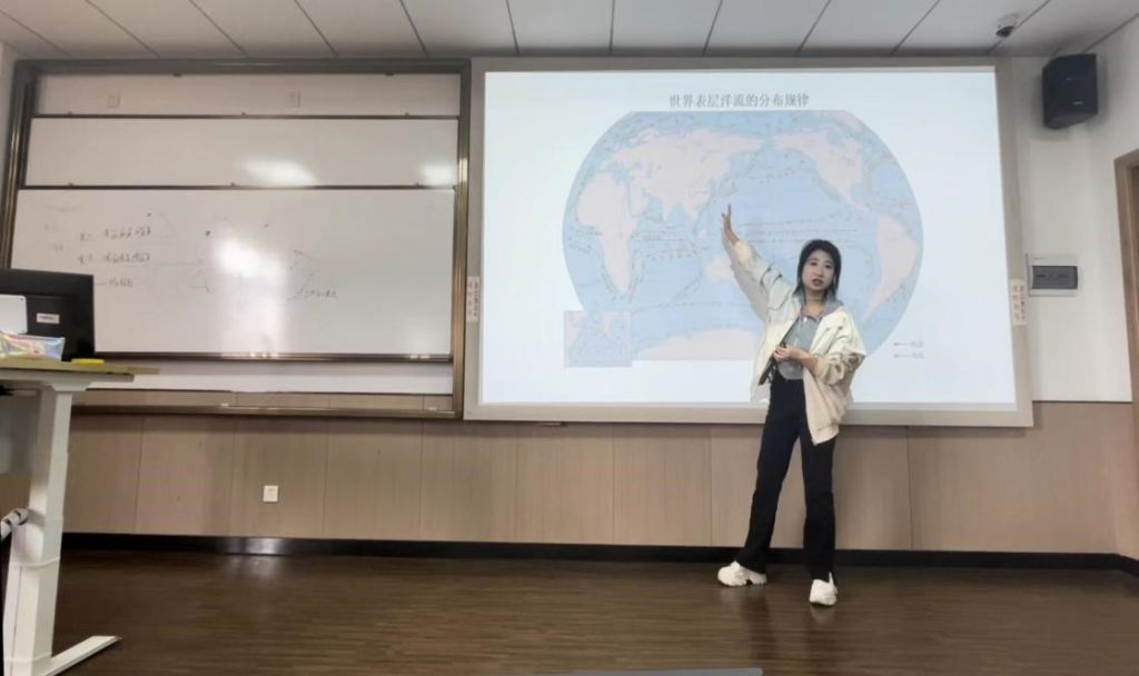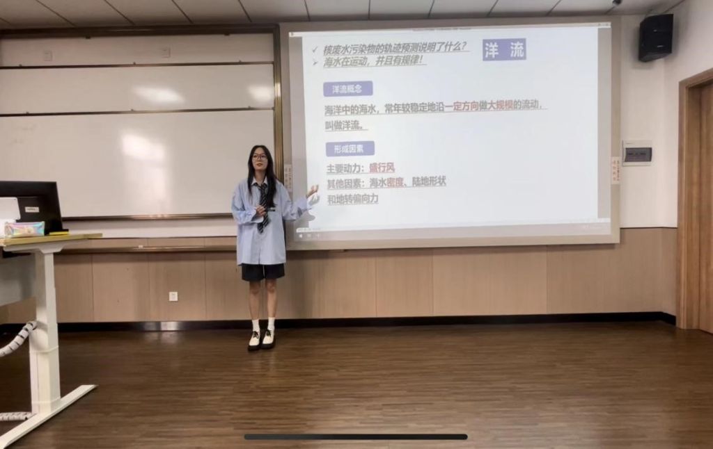 的研究生胡书琦学姐在课前为同学们准备了导学案——世界地图,借日本排放核污水一例导入课程,并核污水的轨迹预测引出洋流的定义、形成因素。胡学姐在授课过程中提出“8/0”洋流结构的记忆口诀,并利用导学案配合板画,设计了课堂互动环节,以帮助学生深化理解记忆。最后回顾课前案例分析洋流对人类生活的影响,强调了对于学生人地协调观的培养。