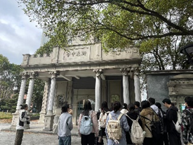 门口后,宁波四中张晓芳副校长、地理教研组长吴芳老师、朱希老师、江杉老师等热烈欢迎了大家的到来,并和大家一起合影留念。张校长向同学们介绍了宁波四中的悠久历史和地理学科的发展情况,接着,吴老师带领我们参观了校园,尤其是校园中复刻的老校门——原“浙东中学”校门,还简单介绍了本校的天文活动,校园中的一草一木都体现了宁波四中的历史底蕴和办学特色。
