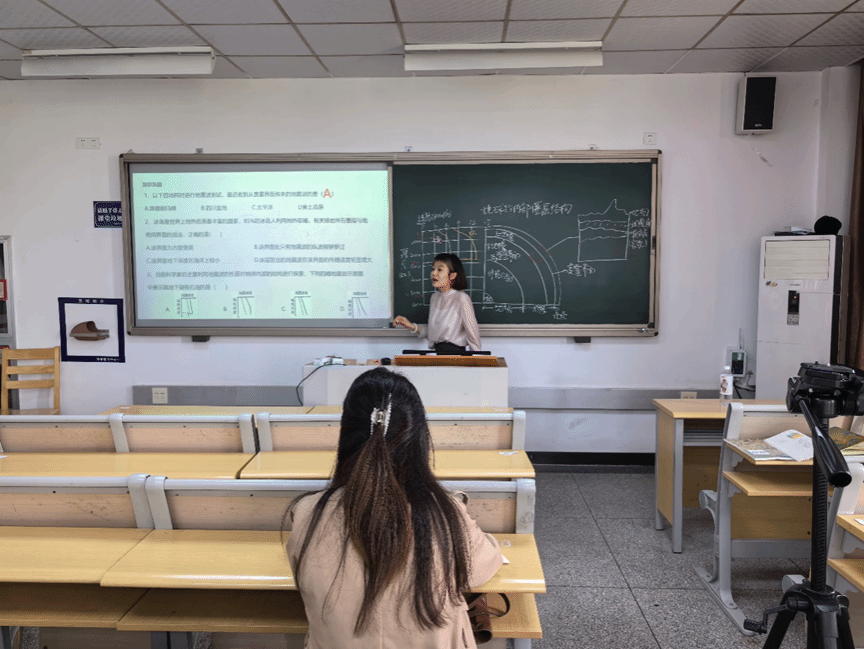 张子墨同学选择人教版第一章第四节“地球的内部圈层结构”为教学内容,通过两道回顾知识的题目作为导入,然后画深度和地震波速度示意图,通过横波和纵波在不同深度的速度的变化来依次向同学们介绍莫霍面和古登堡面,再介绍地壳,上、下地幔和内、外地核,并画出相应的地球圈层示意图。然后重点介绍岩石圈(地壳和上地幔顶部)和软流层,最后通过三道题目来巩固知识。张老师指出本节课缺少学生的参与度,可以让学生尝试画图来加深学生对知识的掌握程度。徐老师提问为什么能够知道地震波在不同深度的速度。