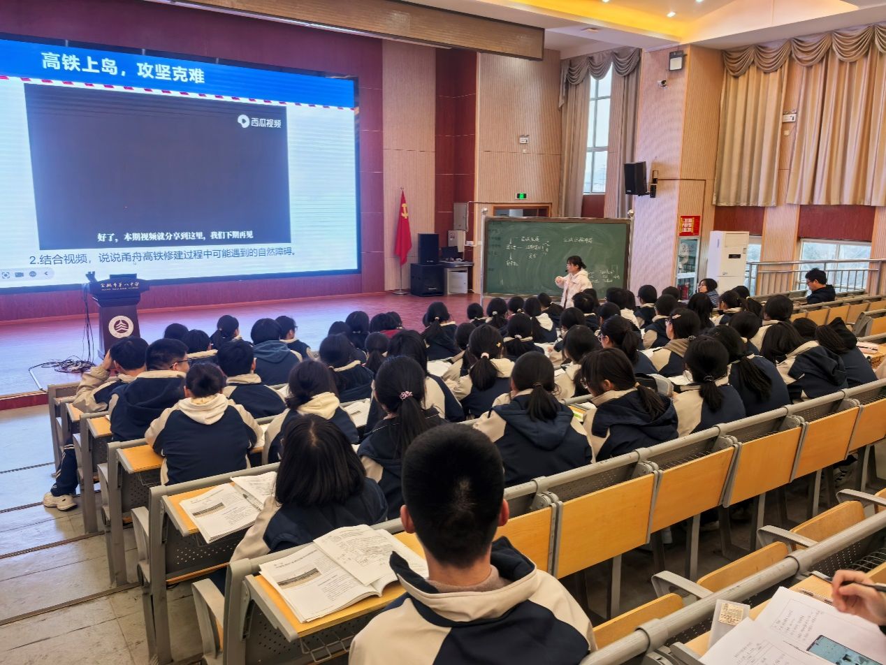 接着开始了正式授课,叶老师以“甬舟铁路”为情境进行导入,并且在授课的过程中,不断引导学生们在“甬舟铁路”这个真实情景下进行思考,围绕了三个问题“要不要修甬舟铁路”“怎么布局甬舟铁路”“能不能修甬舟铁路”三个方面,通过“必要性、可行性、优越性”三环节引导学生探讨区域发展与交通布局的关系,强调学科思维逻辑与知识迁移能力。叶老师在授课过程中注重课堂氛围,把握课堂节奏,呈现了情境交融的教学范例,在真实问题探究中达成学科素养的落地生根。