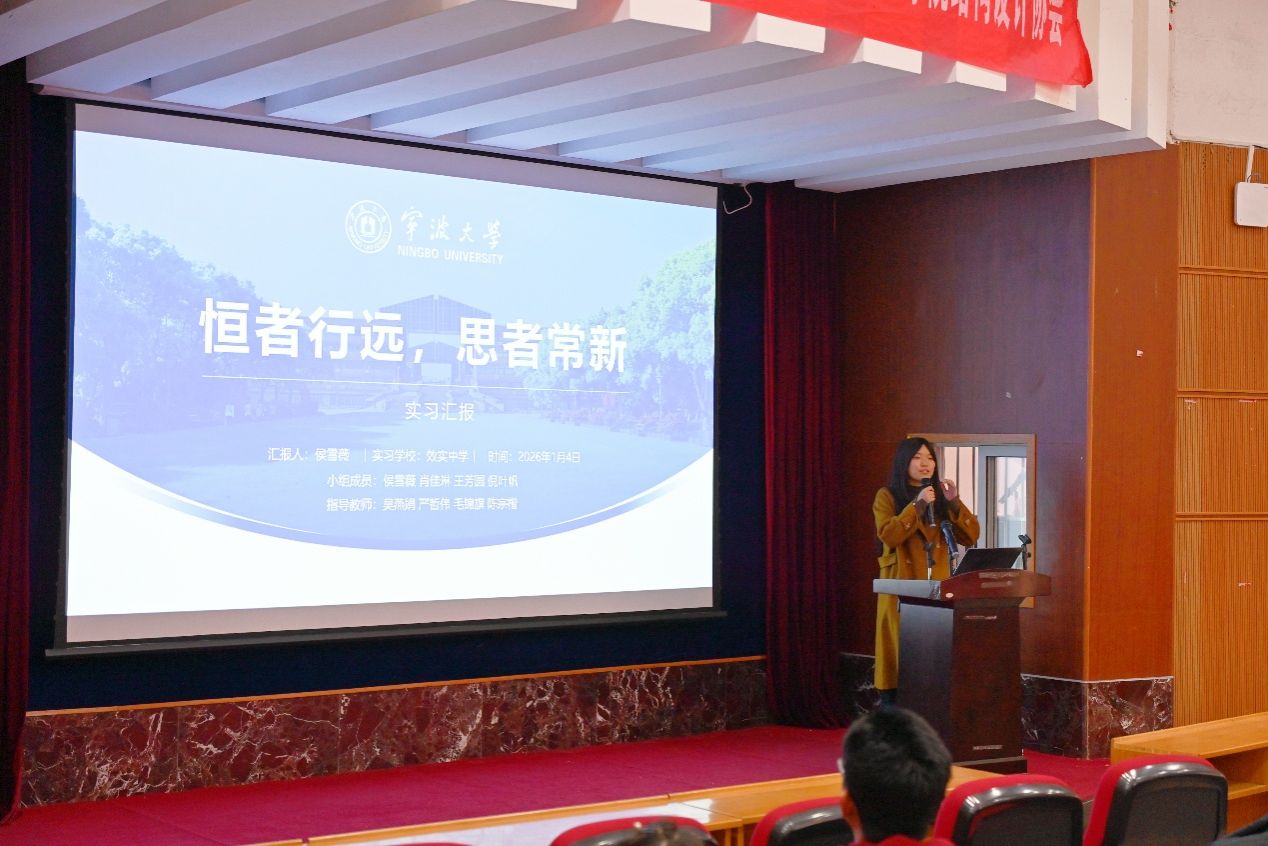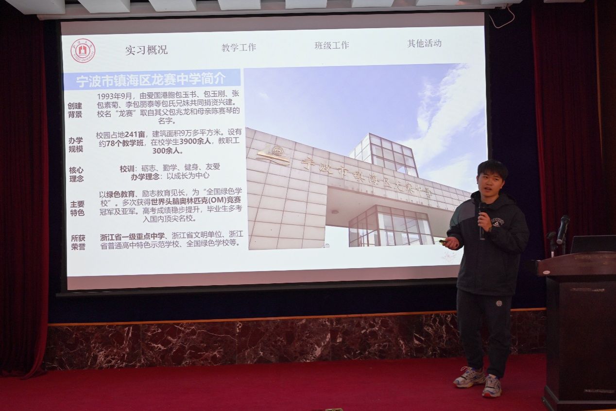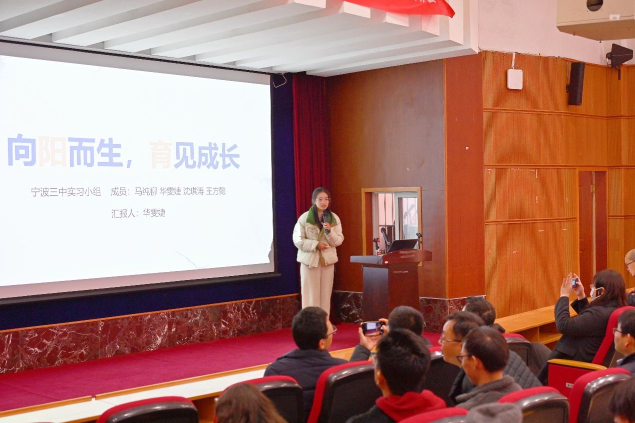 宁波三中实习小组汇报人华雯婕以 “向阳而生,育见成长” 为主题,分四篇章扎实推进:“采光” 阶段累计听课超 30 节、人均批改作业 500 余份,深耕教学基础;“散光” 阶段独立授课、参与试题命制,在实践中锤炼技能;“熠光” 阶段组织运动会、策划主题班会,践行多元育人理念;“沐光” 阶段小组互助磨课、共享资源,携手共克难题。实习期间,同学们实现了从 “准教师” 到教学实践者的蜕变,离不开校地指导老师的悉心帮扶。未来,他们将带着这段时光的收获与感悟,在教育道路上继续追光前行,续写育人初心。