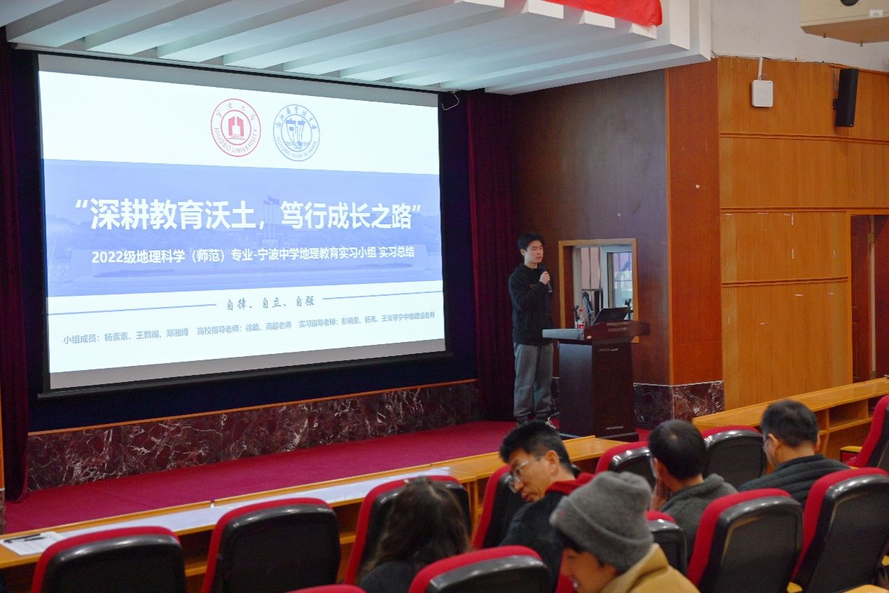 由杨素素、王麟阁、郑湘绮组成的宁波中学实习小组,在徐皓、高超两位老师的指导下,于宁波中学圆满完成为期十四周的地理教育实习。汇报人王麟阁提到,实习初期,地理教研组老师通过细致讲解工作、分享教学经验,帮助三名实习老师快速适应环境。实习期间,小组成员完成听课、批改试卷等基础工作,参与地理考试监考,应对各类突发状况,深刻体会到理论与实践结合的重要性;同时协助消防演习疏导、担任运动会裁判等校园事务,切实感受教师工作的责任。教学实践中,三名实习教师覆盖高一至高三课程,经多次说课、磨课提升技能。王麟阁首节课虽然紧张卡壳,但在学生指正后快速调整状态;杨素素在水循环课程中持续反思优化;郑湘绮推翻原设计,聚焦高考真题重构高三复习课,获得老师高度肯定。此次实习让三名实习老师实现从学生到教师的角色蜕变,深化了对教育“始于专业更有温度”的认知。他们将带着实习收获在教育之路上稳步前行。