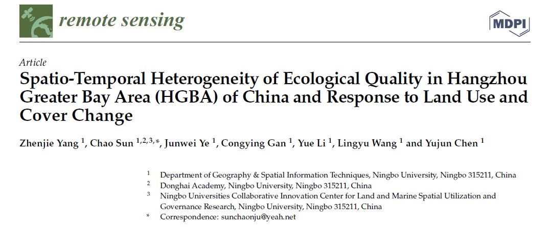 地理与空间信息技术系孙超教师(通讯作者)指导下,在《Remote Sensing》期刊(中科院SCI二区,IF=5.349)发表了题为“Spatio-Temporal Heterogeneity of Ecological Quality in Hangzhou Greater Bay Area (HGBA) of China and Response to Land Use and Cover Change”的学术论文(论文链接://www.mdpi.com/2072-4292/14/21/5613/htm)。