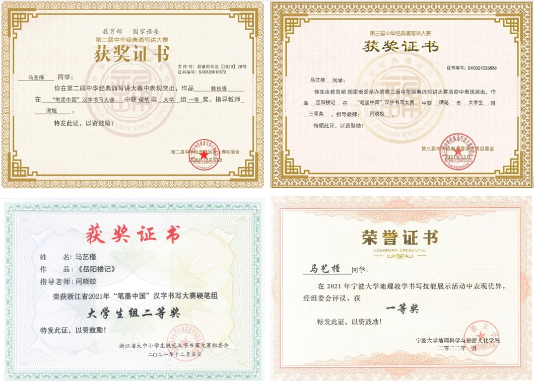 老师与宁波市名师骆海军老师、张小肖老师的共同指导下,学子们连续三年在长三角师范生教学基本功大赛中取得优异成绩,获得一等奖2项、三等奖1项;荣获浙江省师范生教学技能竞赛二等奖、三等奖各一项;“笔墨中国”汉字书写大赛中硬笔类大学组一等奖2项,浙江省大学组二等奖1项。经过教学技能的培养,地理科学(师范)专业涌现出大批优秀学子, 2017级地理科学(师范)班张悦同学、2018级地理科学(师范)班徐浩和王玉育同学、2019级地理科学(师范)班杨莹同学经过层层选拔,以过硬的专业实力分别入选开元网