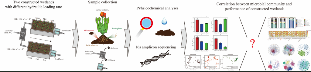 研究团队在浙江省宁波市某农村构建了两块种植美人蕉的人工湿地用于附近居民生活污水处理。除水力负荷不同之外,两块人工湿地其余设计参数均保持一致。稳定运行一年之后,在维护期对人工湿地进行破坏性采样,分别采集人工湿地的进出水、基质、根际土和根内生样本。研究团队发现不同水力负荷下人工湿地的出水水质存在显著差异,高水力负荷人工湿地表现出了更好的总氮、硝态氮和化学需氧量的去除效果,而低水力负荷人工湿地则呈现出了更好的氨氮去除效果。通过对人工湿地微生物群落特征进行分析,研究团队发现不同水力负荷人工湿地微生物群落呈现较大差异。其中,一些反硝化细菌、硫循环相关细菌和硫自养反硝化细菌在高水力负荷人工湿地中聚集,这解释了高水力负荷人工湿地中更高的总氮和硝酸盐氮去除效果。此外,氨氧化古菌在低水力负荷人工湿地中的富集有助于氨氮的去除。值得注意的是,一些人畜共患病原菌在美人蕉根系中定殖,且在高水力负荷人工湿地中更加明显,说明了污水中的人畜共患病原菌可以通过入侵人工湿地植物根系并长期持留。近年来,一些可食用植物因其额外的经济效益而被应用于人工湿地中。此外,人工湿地是相对开放的环境,与周边居民的生物安全密切相关。因此,农村人工湿地的潜在生物污染风险需引起重视。相关研究成果发表于《Water research》,该期刊2023年度影响因子为12.8。