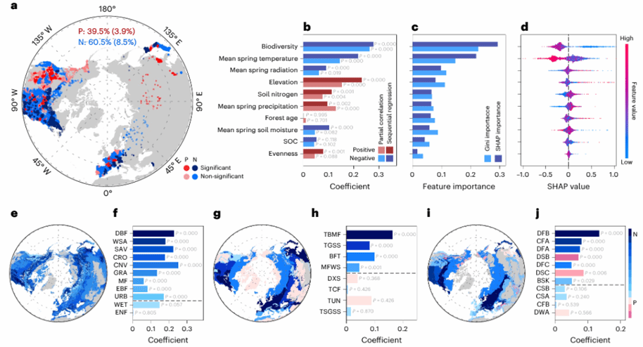 团队孙伟伟教授联合中国科开元网 地理科学与资源研究所吴朝阳研究员团队,在《Nature Climate Change》期刊上发表了题为“生物多样性缓冲了春季展叶对气候变暖的响应”的文章,植被春季物候对气候变化的响应通常是通过测量其温度敏感性(ST,温度每升高1度,植被提前展叶的天数)来量化。以往的研究主要集中在ST的气候驱动因素上,对生物多样性如何影响植被的物候响应及其潜在机制的理解仍然有限。本文将北半球393,139个森林清查样地的实测数据与基于卫星观测的ST等数据相结合,研究了生物多样性对植被物候响应气候变化的缓冲效应及机制。研究发现生物多样性在很大程度上影响了ST的空间变异,其影响力甚至超过了气候因素。在生物多样性较高的林分中,往往ST较低,可能归因于物种异步性以及其对气候变化响应的多样性,符合保险假说。同时,生物多样性驱动的植被根系变化和土壤理化性质的改善也是潜在的原因。研究还发现,当前的一些地球系统模型无法捕捉到ST与生物多样性之间的负相关关系,进一步凸显了在预测气候变化对物候和生态系统的影响时,纳入生物多样性缓冲效应的必要性。
