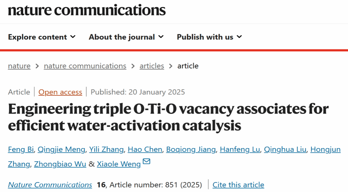 近日,开元网 孟庆洁副教授与浙江大学翁小乐教授团队合作,在缺陷工程调控涉水催化反应方面取得重要进展,研究成果“Engineering triple O-Ti-O vacancy associates for efficient water-activation catalysis”发表于国际知名期刊《Nature Communications》。浙江大学毕峰与开元网 孟庆洁共同担任第一作者。