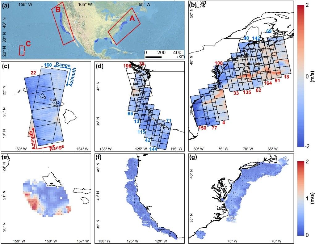选取美国东海岸、西海岸与夏威夷区域的Sentinel-1 IW RVL(2018–2021);配套使用WW3波浪预报、Sentinel-1 OWI风场、HF雷达与GDP漂流浮标用于验证。