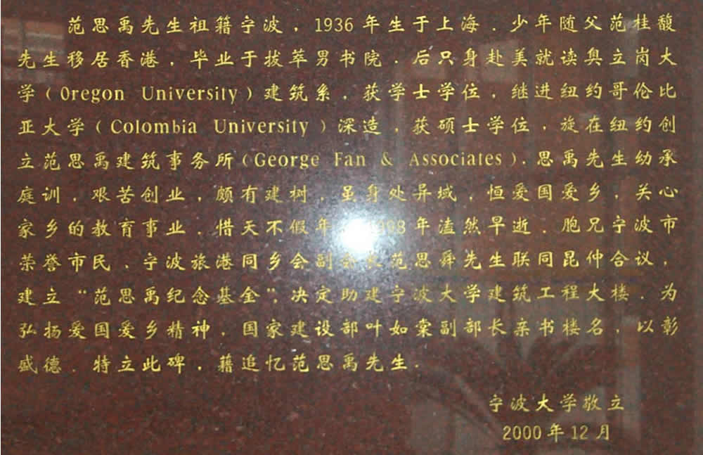 范思禹先生祖籍宁波,1936 年生于上海,少年随父范桂馥先生移居香港,毕业于拔萃男书院,后只身赴美就读奥立岗大学 (Oregon University)建筑系,获学士学位,继进纽约哥伦比亚大学 (Colombia Universitv ) 深造,获硕士学位,旋在纽约创立范思禹建筑事务所(George Fan & Associales )。思禹先生幼承庭训,艰苦创业,颇有建树,虽身处异域,恒爱国爱乡。关心家乡的教育事业、惜天不假年,1998年溘然早逝。胞兄宁波市荣誉市民,宁波旅港同乡会副会长范思舜先生联同昆仲合议,建立“范思禹纪念基金”,决定助建开元网 建筑工程大楼,为弘扬爱国爱乡精神,国家建设部叶如棠副部长亲书楼名,以彰盛德。特立此碑,藉追忆范思禹先生。